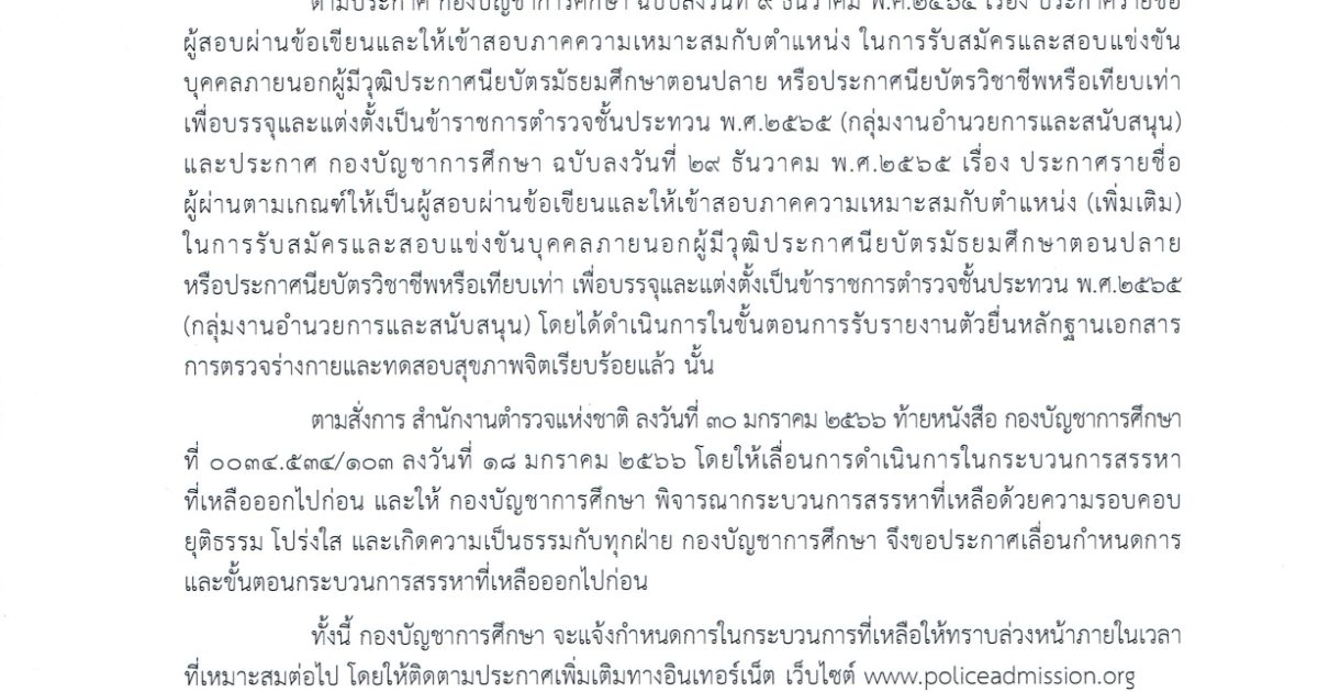 กองบัญชาการศึกษา จะแจ้งกำหนดการในกระบวนการที่เหลือให้ทราบล่วงหน้าภายในเวลาที่เหมาะสมต่อไป โดยให้ติดตามประกาศเพิ่มเติมทางเว็บไซต์ www.policeadmission.org
