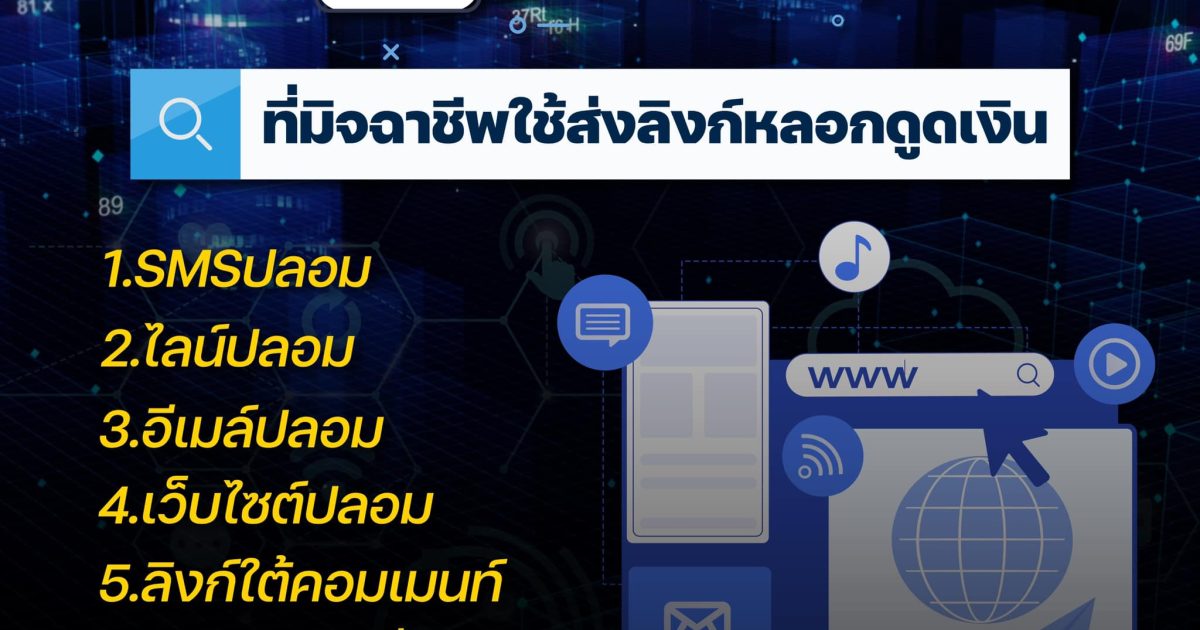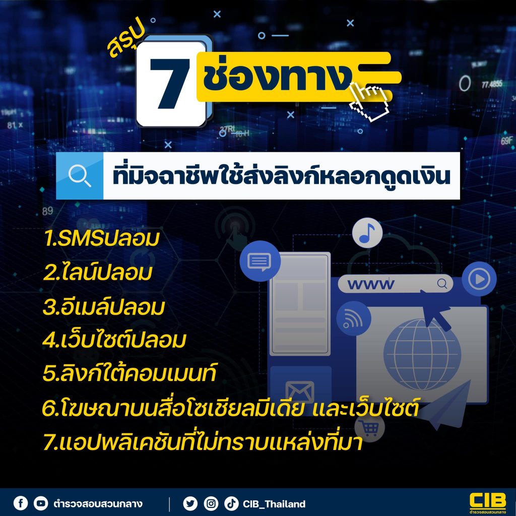 ตำรวจสอบสวนกลาง(CIB) ได้สรุปช่องทางที่มิจฉาชีพมักจะใช้ส่งลิงก์หลอกดูดเงิน จำนวน 7 ช่องทาง ดังนี้